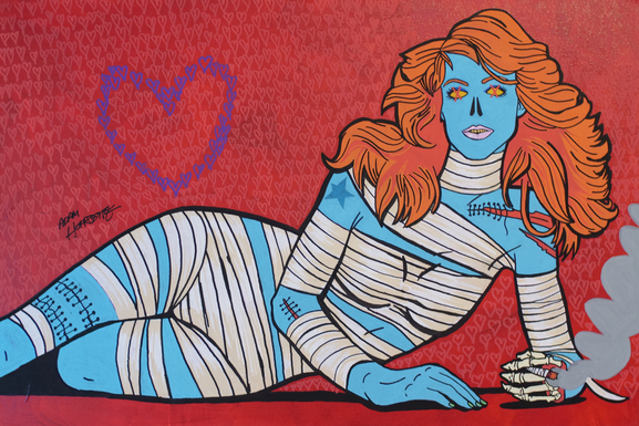 Adam has a fascination with horror movies and pop culture. The mummies series started with a mummy king and has been building a loose narrative about them. Mummies are inspired by cartoons, pop culture, and pinup models. Each mummy is uniquely individual.